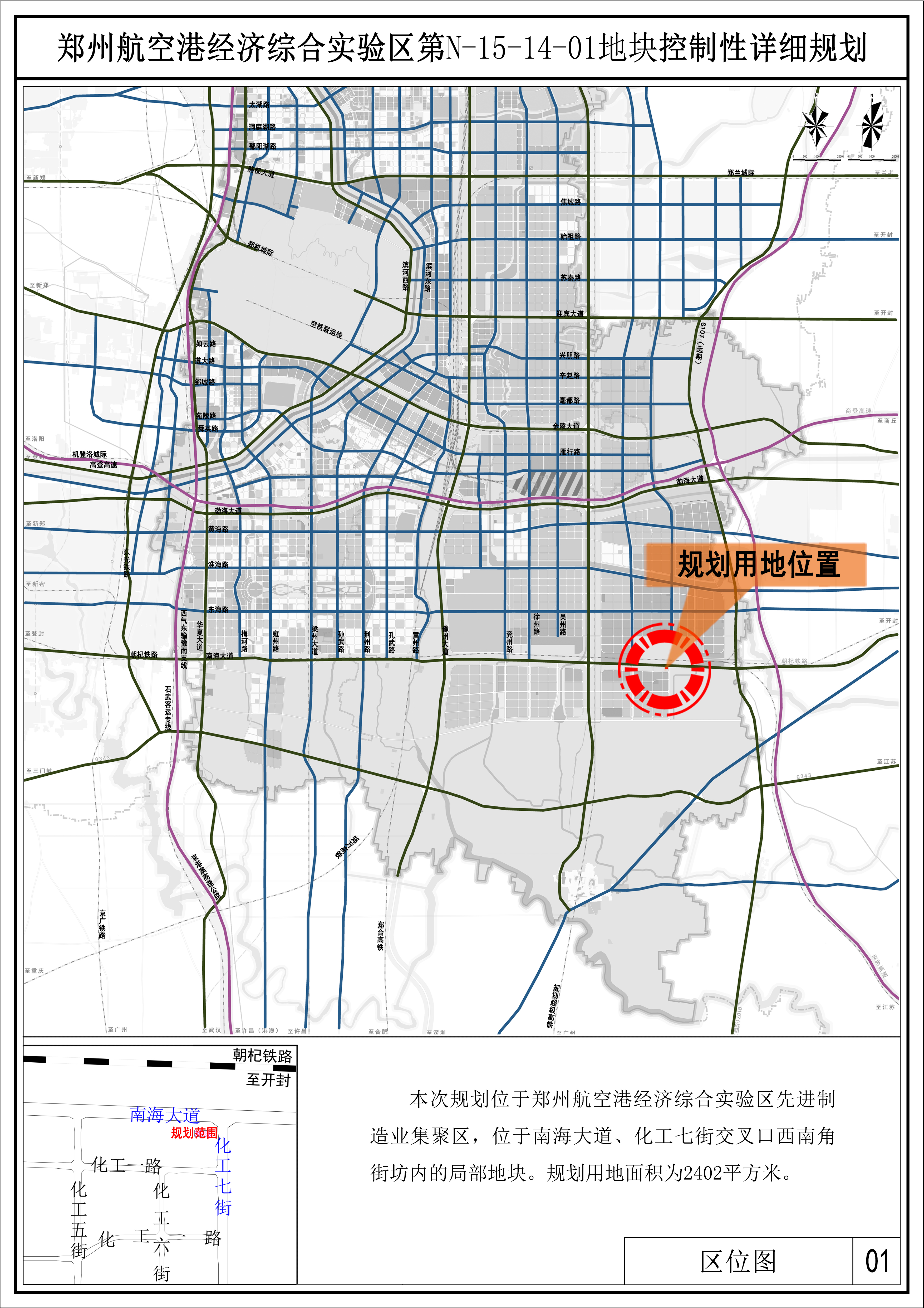 三、项目概况:本次规划位于郑州航空港经济综合实验区先进制造业集聚区,南海大道、化工七街交叉口西南角街坊内的局部地块。规划用地面积为2402平方米。