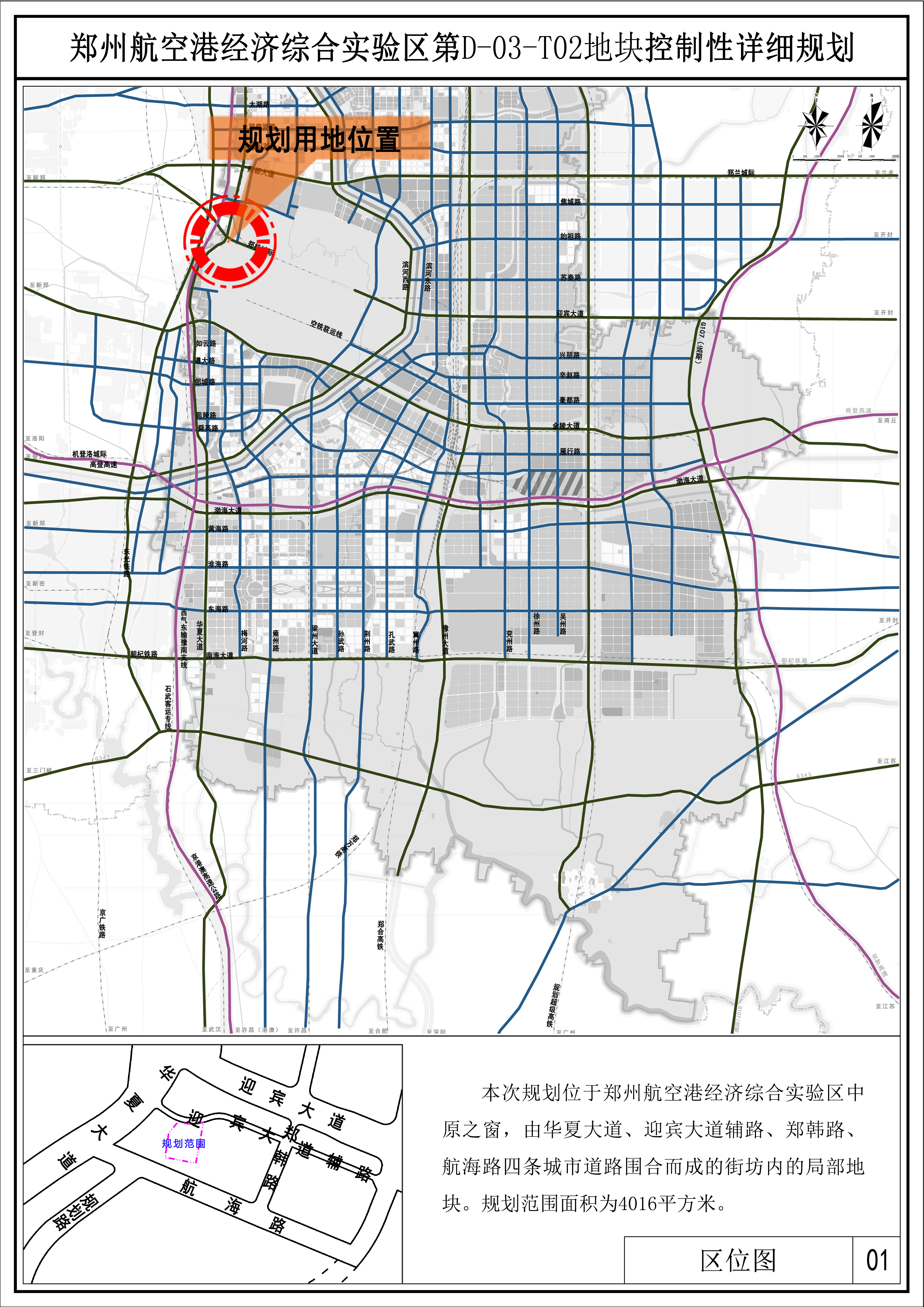 用地位置: | 华夏大道、迎宾大道辅路、郑韩路、航海路四条城市道路围合而成的街坊内的局部地块。 |