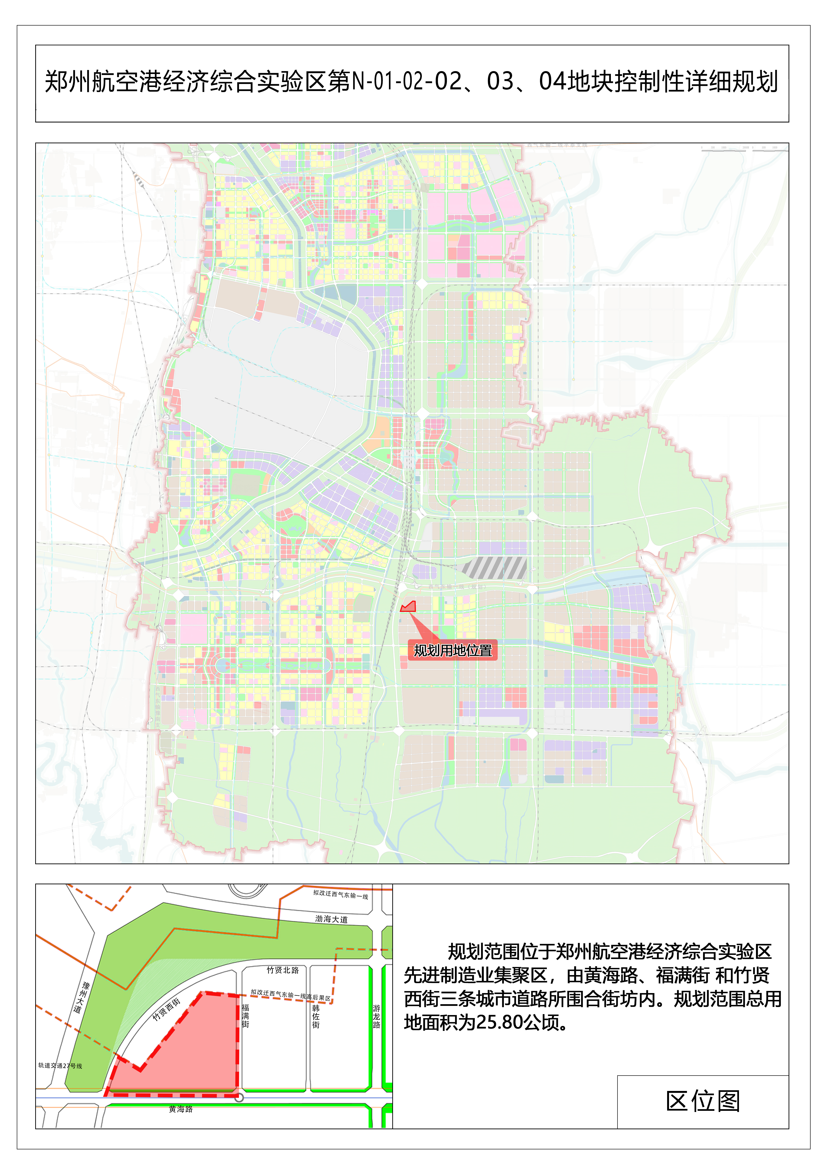 三、项目概况:规划区位于郑州航空港经济综合实验区先进制造业集聚区,由黄海路、福满街、和竹贤西街三条城市道路所围合街坊内,规划范围总用地面积为25.80公顷。