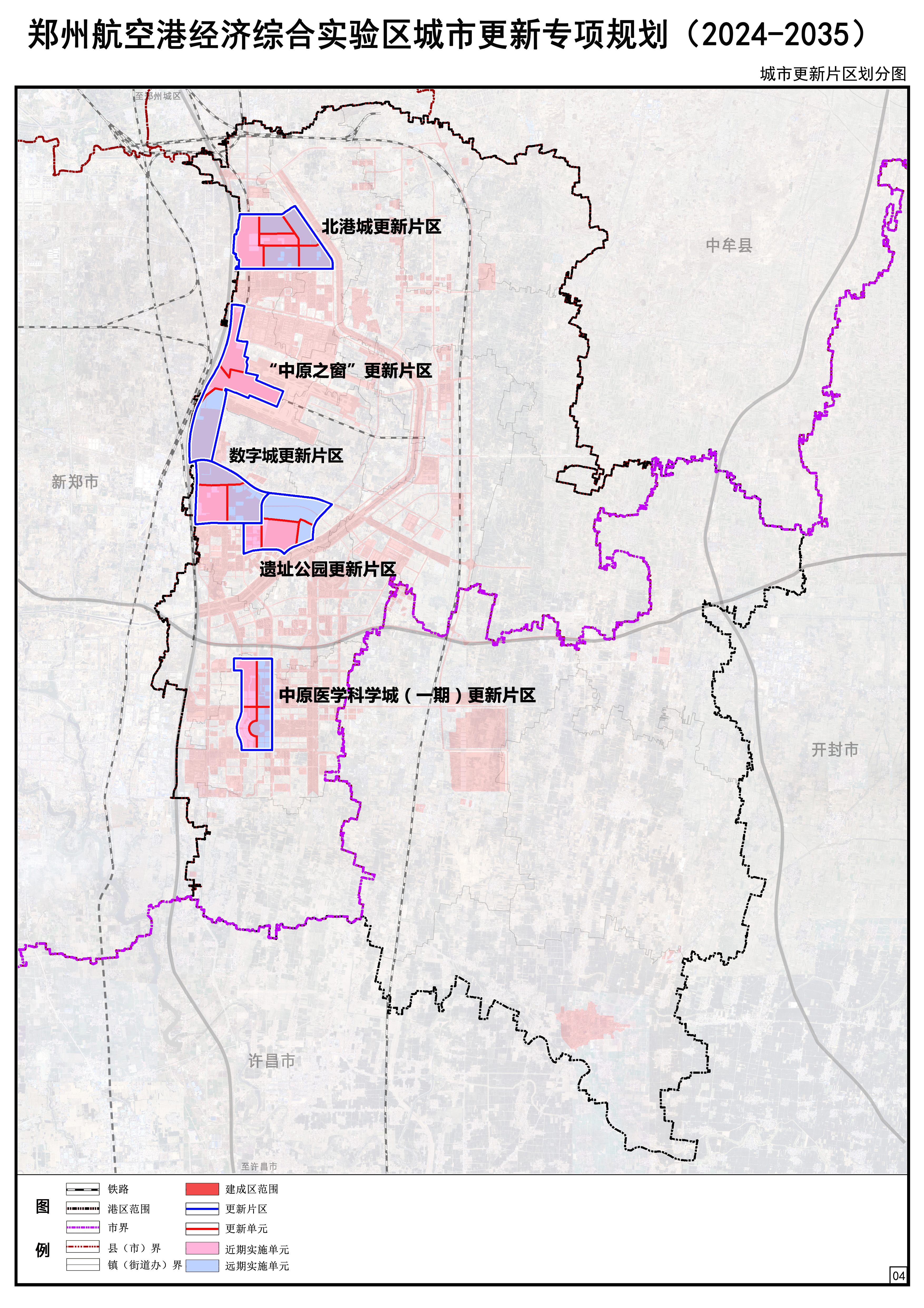 1、分类更新:共划定重点更新片区5个,分别为北港城片区、中原之窗片区、数字城片区、遗址公园片区、中原医学科学城片区,总面积约32平方公里。