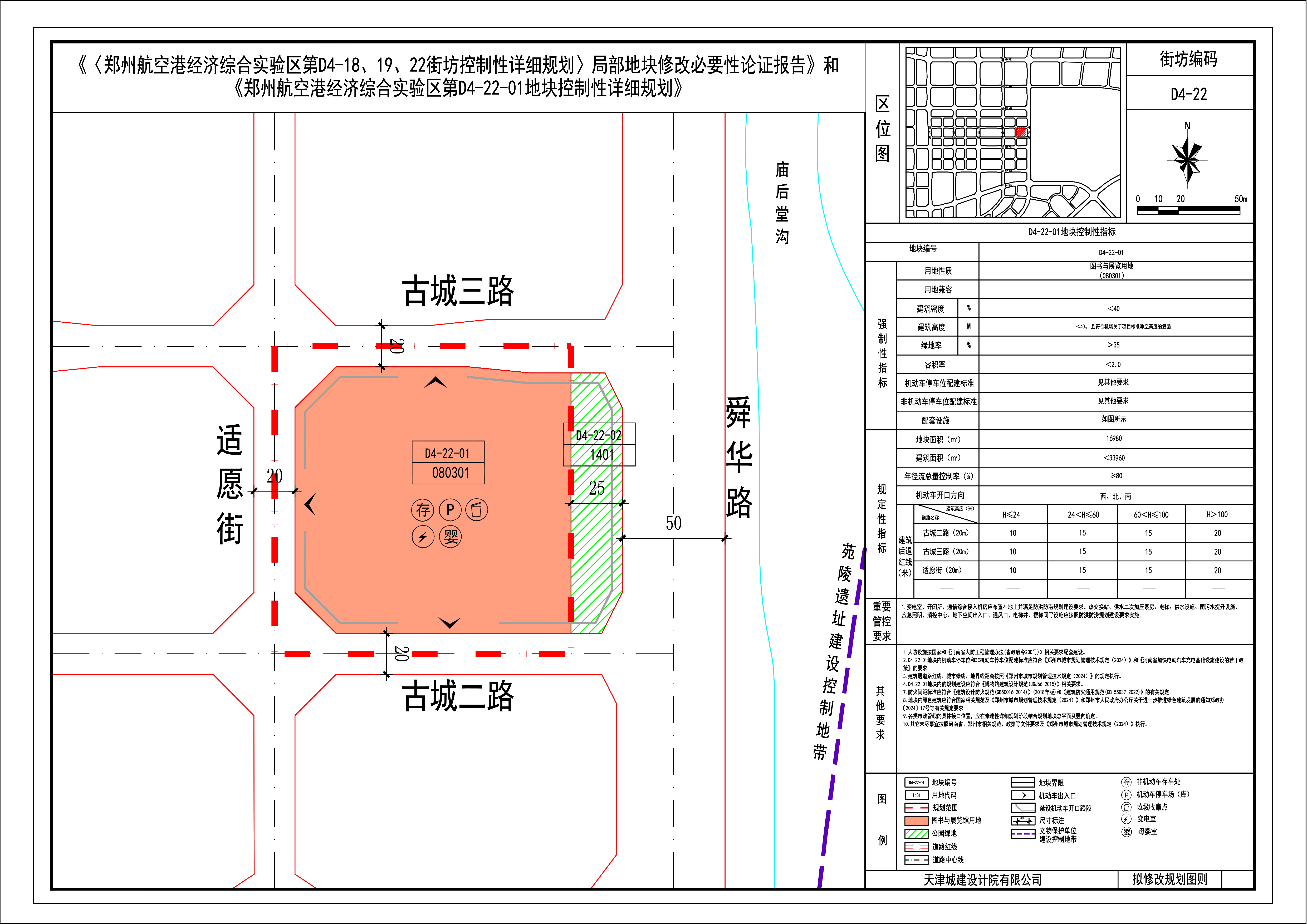 (2)修改后地块控制指标:D4-22-01地块用地性质为图书与展览用地(080301),容积率<2.0,建筑密度<40%,建筑高度<40米,且须符合机场关于项目核准净空高度的复函,绿地率>35%。