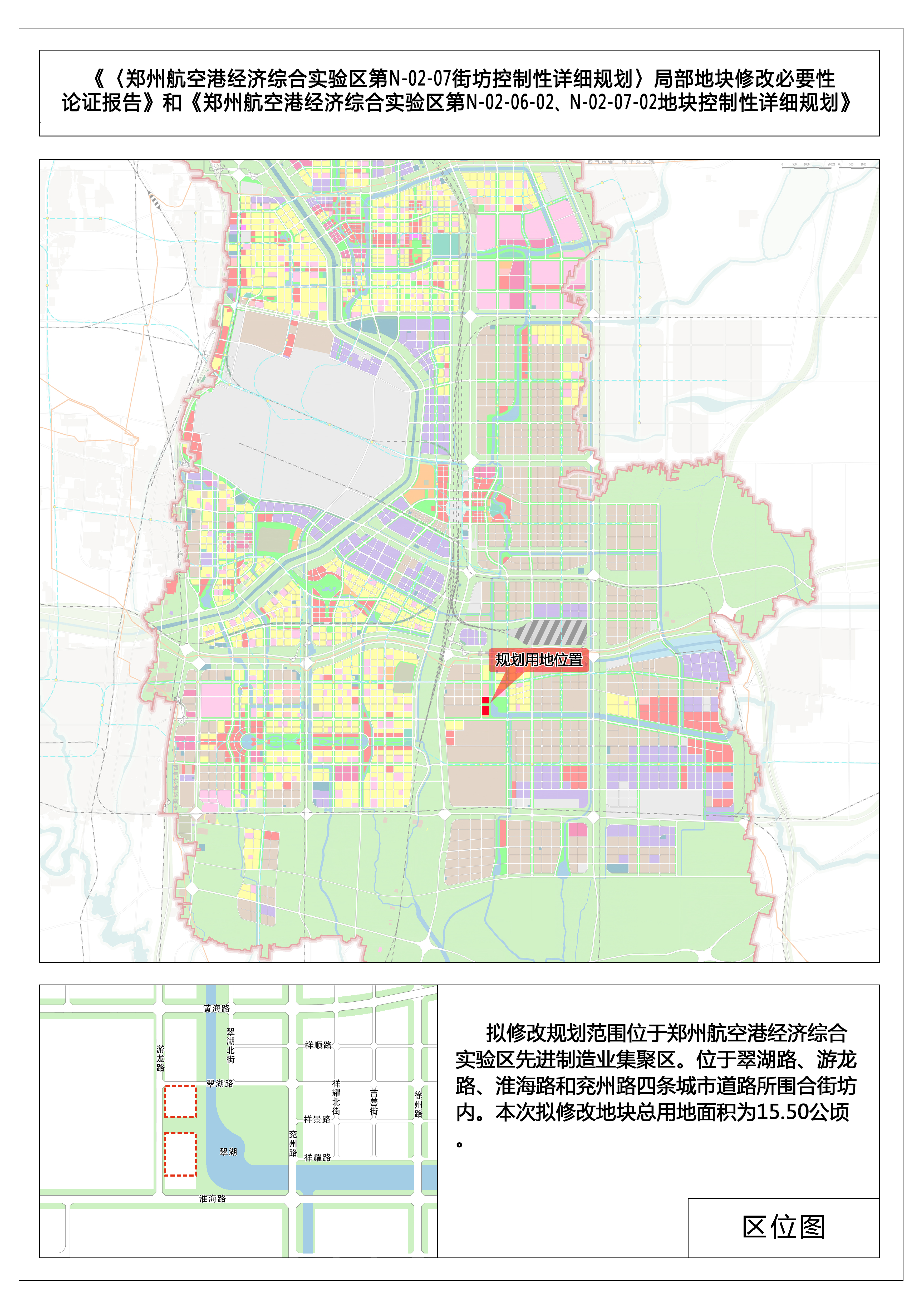 用地位置:规划范围位于郑州航空港经济综合实验区先进制造业集聚区,位于翠湖路、游龙路、淮海路和兖州路四条城市道路所围合街坊内。