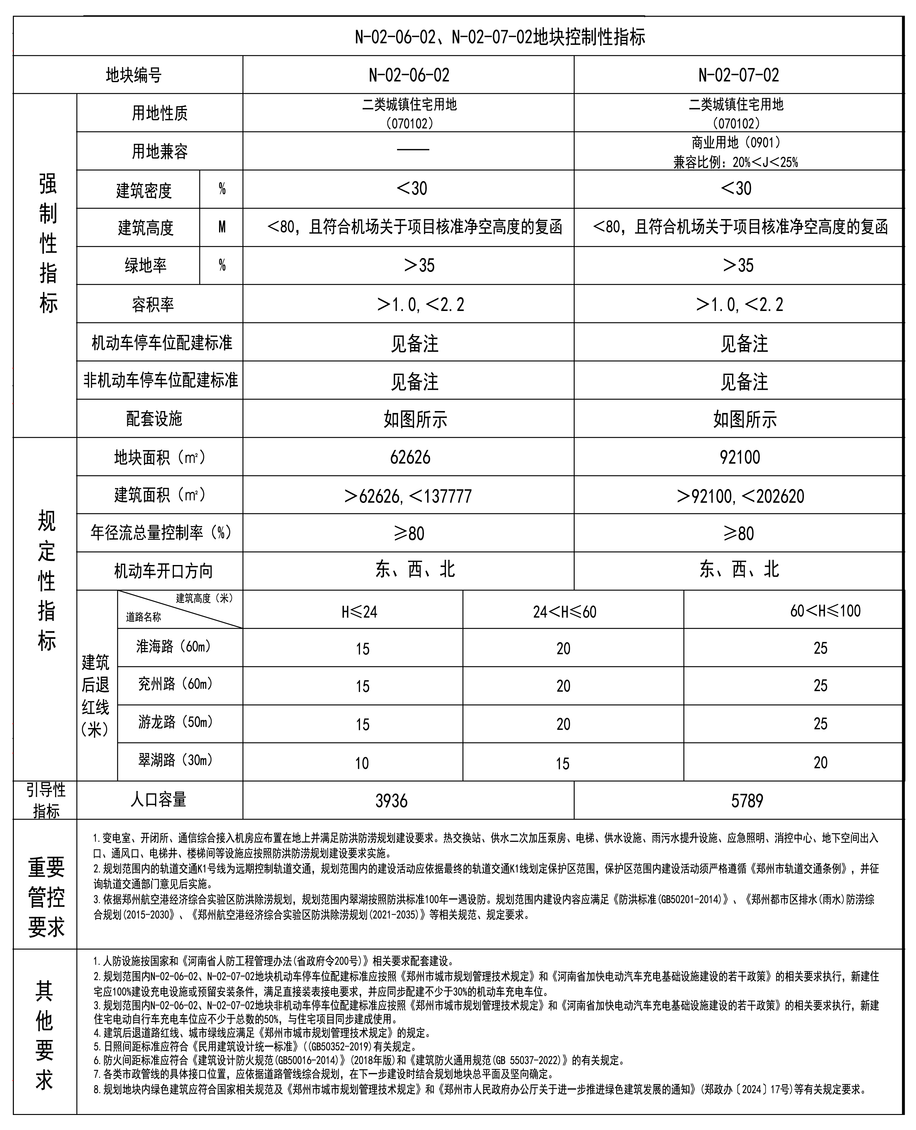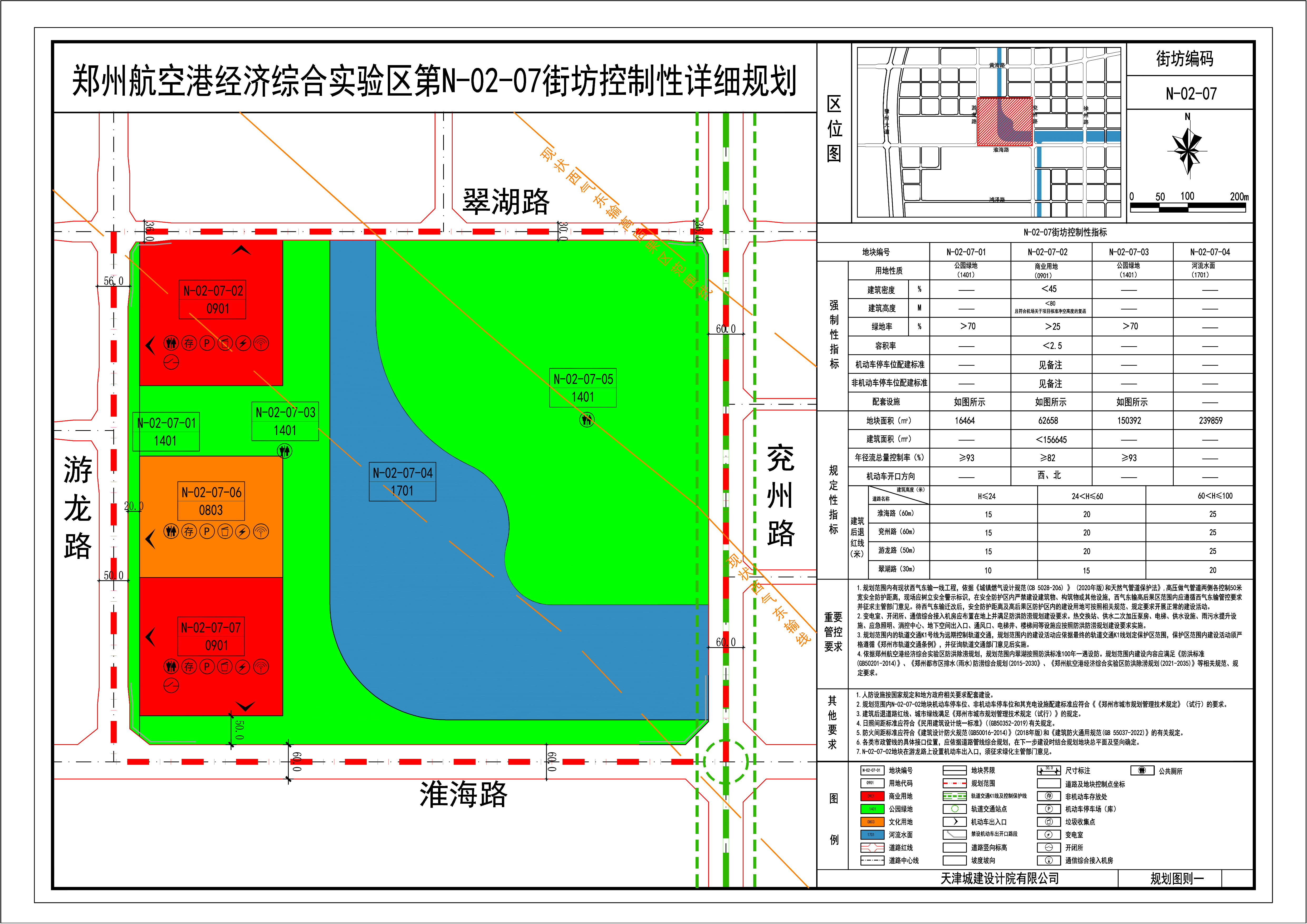 《郑州航空港经济综合实验区第N-02-07街坊控制性详细规划》于2024年2月由郑州航空港经济综合实验区管理委员会批复,该规划中控制N-02-07-02地块用地性质为商业用地(0901),容积率为<2.5,建筑密度<45%,建筑高度<80米(且须符合机场集团关于项目核准净空高度的复函),绿地率>25%;控制N-02-07-06地块用地性质为文化用地(0803),容积率为<1.5,建筑密度<30%,建筑高度<45米(且须符合机场集团关于项目核准净空高度的复函),绿地率>35%;控制N-02-07-07地块用地性质为商业用地(0901),容积率为<2.5,建筑密度<45%,建筑高度<80米(且须符合机场集团关于项目核准净空高度的复函),绿地率>25%。