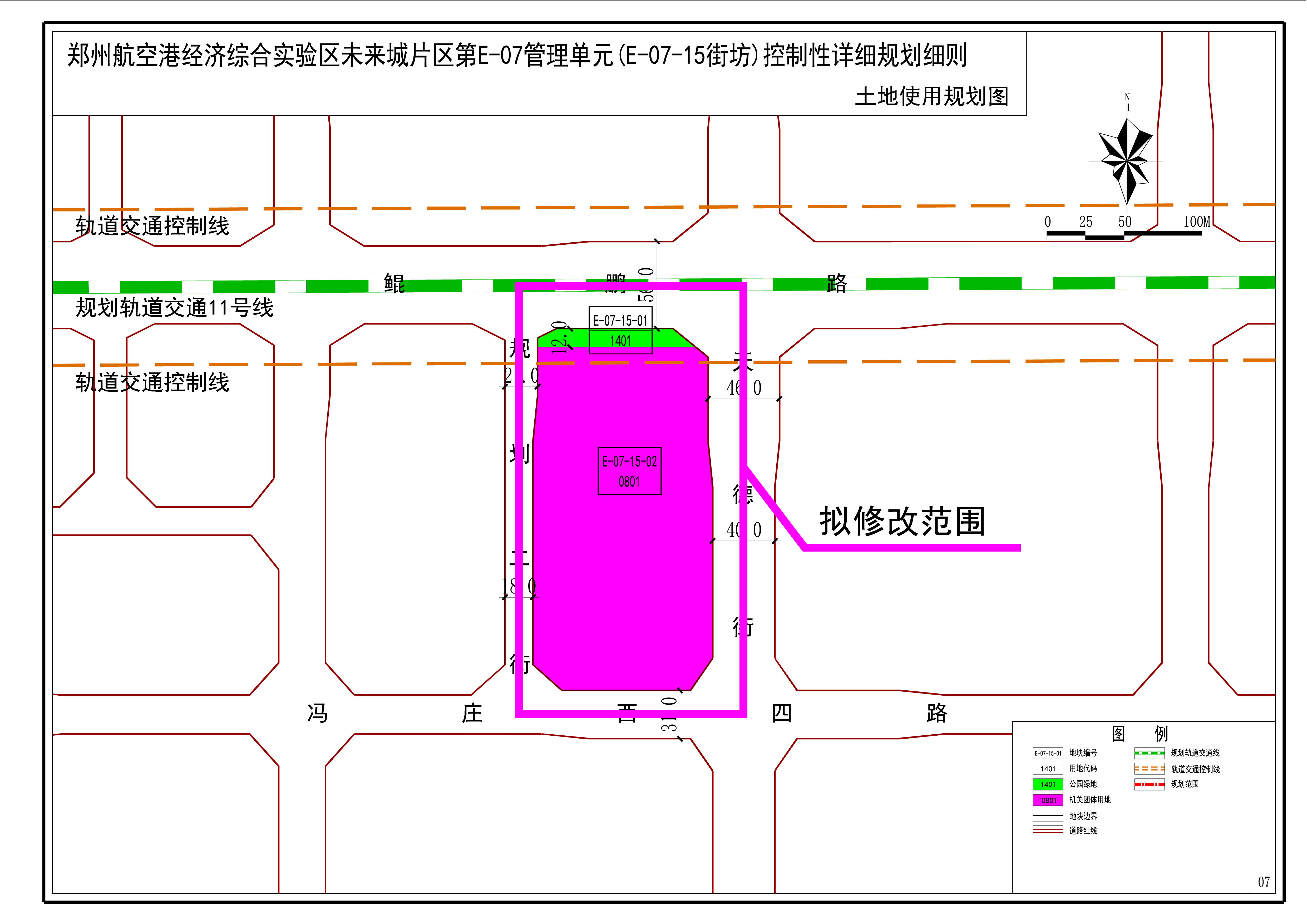 (1)将《郑州航空港经济综合实验区未来城片区第E-07管理单元(E-07-15街坊)控制性详细规划细则》中E-07-15街坊中部分用地性质由城市道路用地调整为公园绿地、机关团体用地;