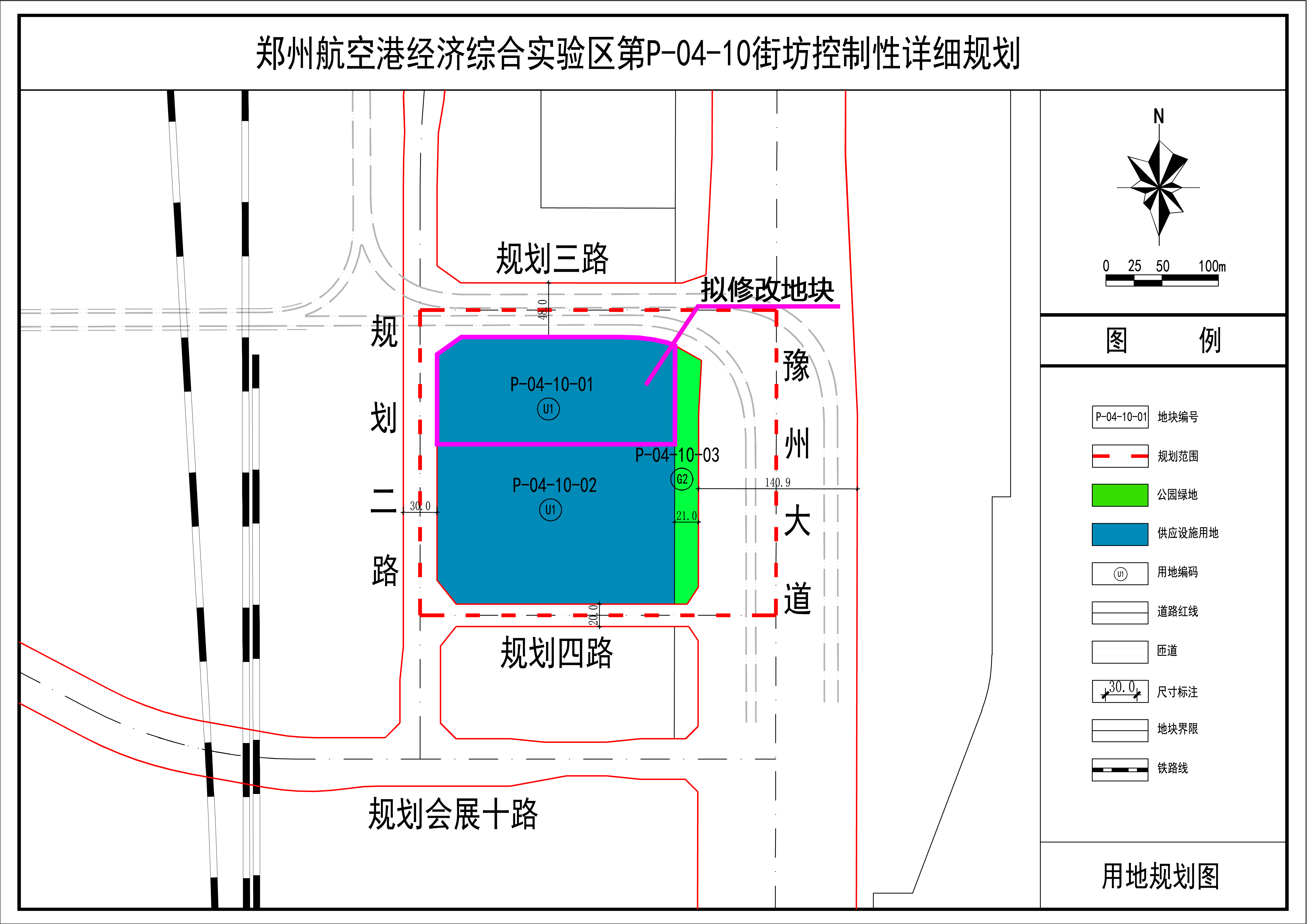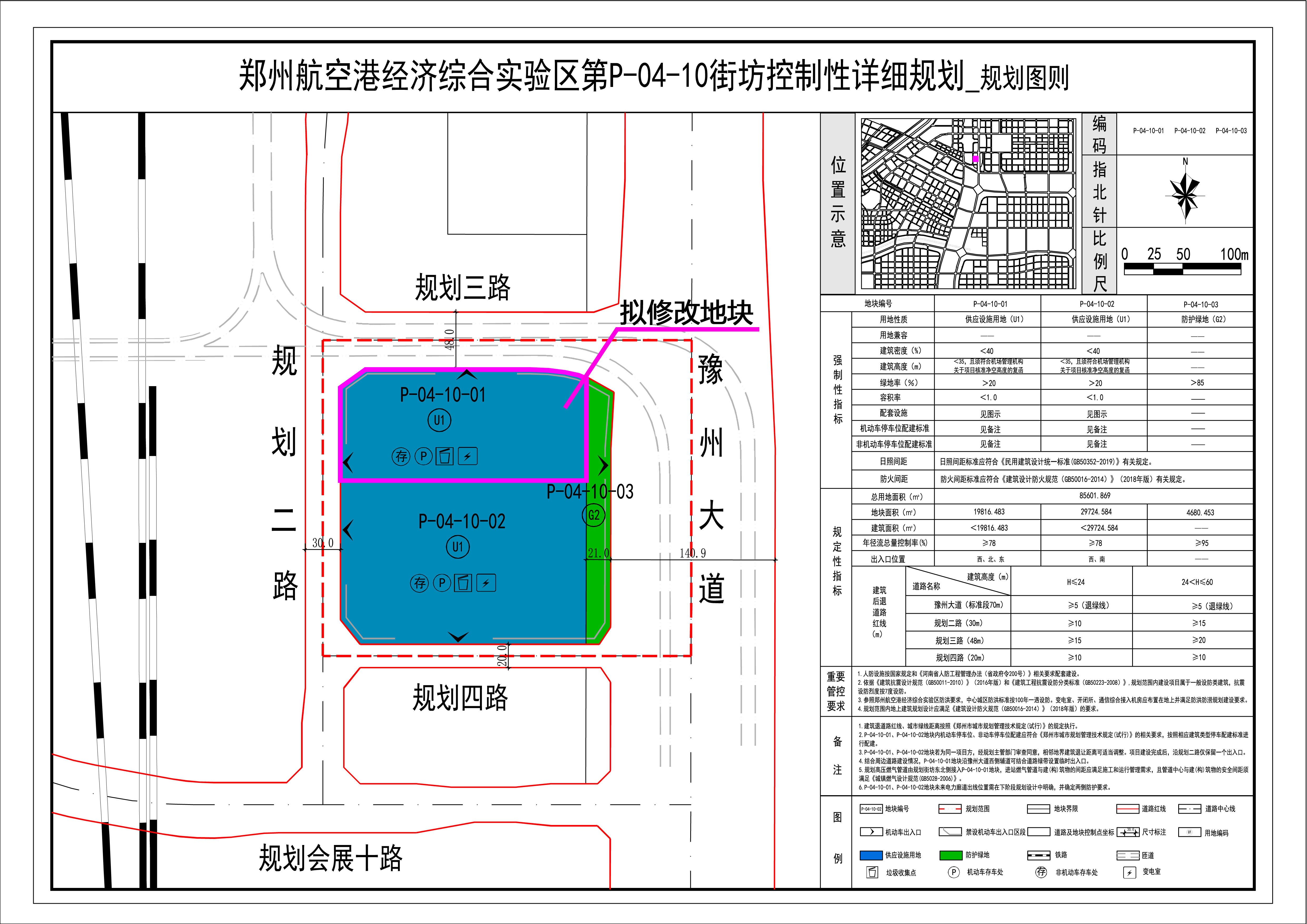 拟修改地块涉及《郑州航空港经济综合实验区第P-04-10街坊控制性详细规划》,于2022年3月19日获郑州航空港经济综合实验区管理委员会批复,该规划中控制P-04-10-01地块用地性质为供应设施用地(U1)。